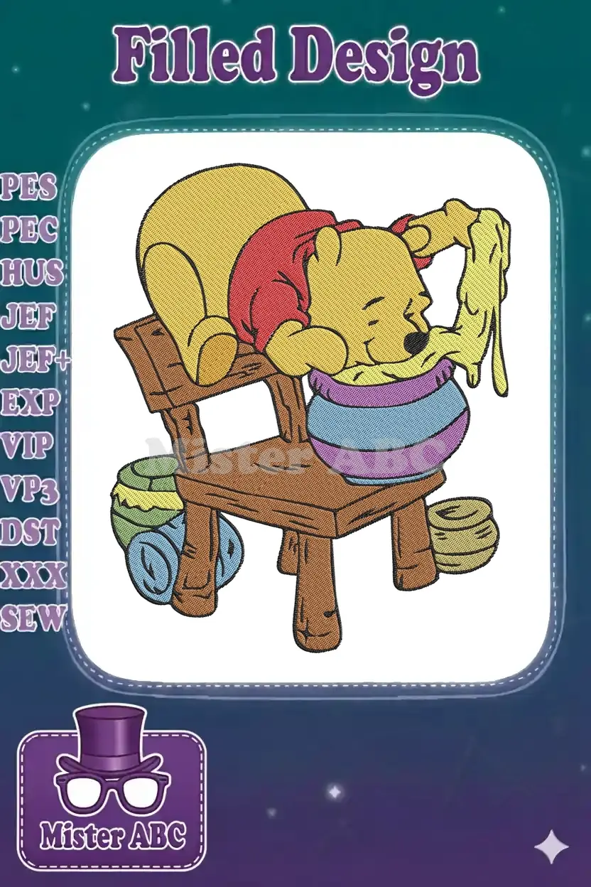 Adorable Winnie the Pooh embroidery design, showcasing the beloved bear fast asleep with his head deep in a honey pot. A charming piece for any Pooh fan’s collection.