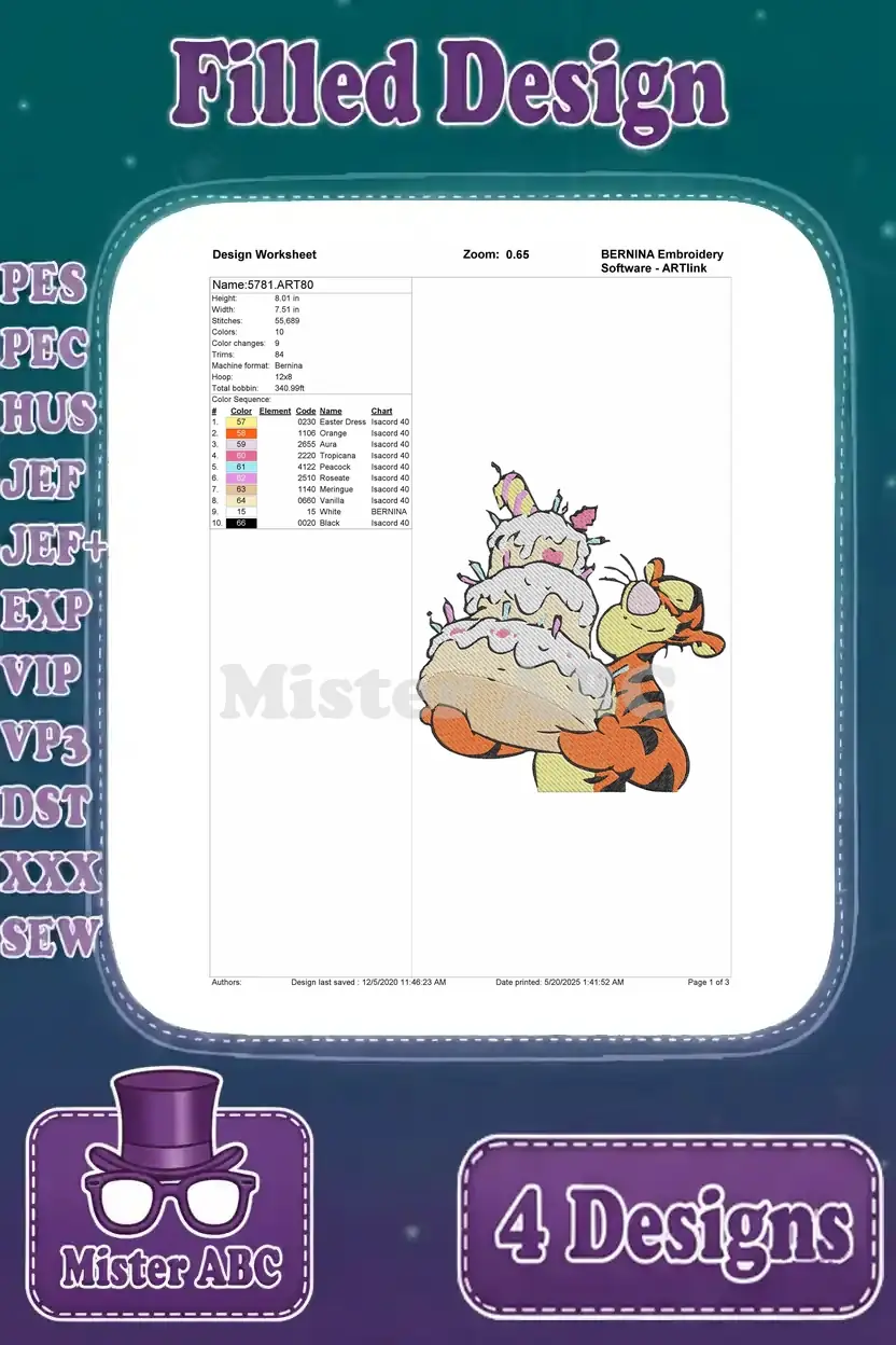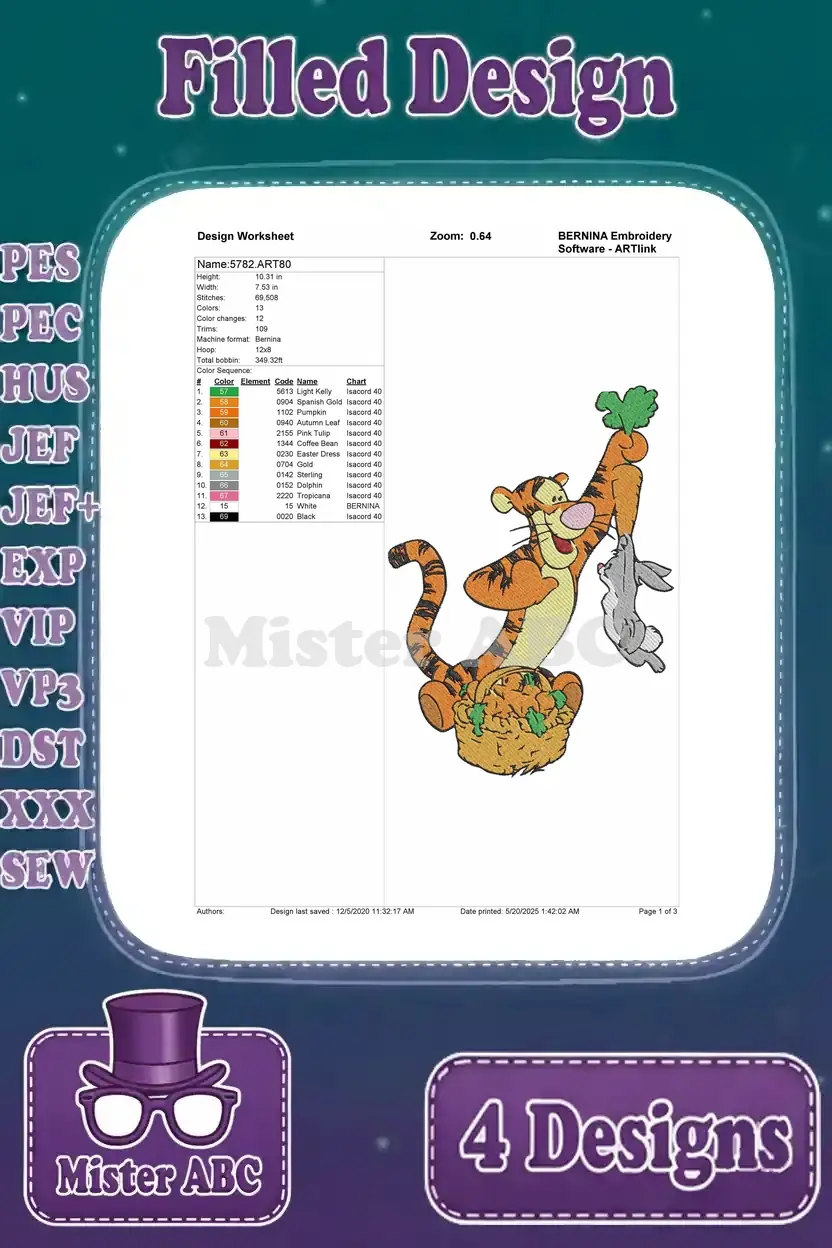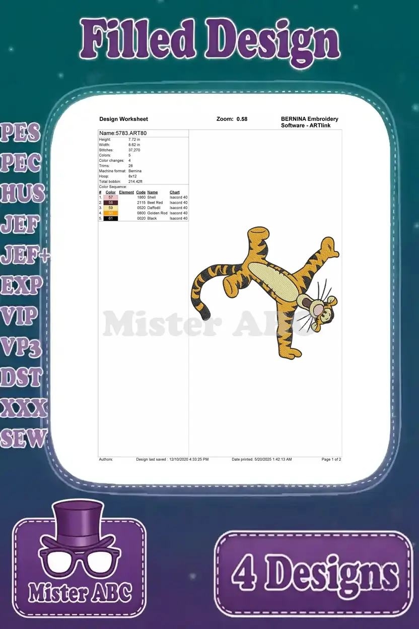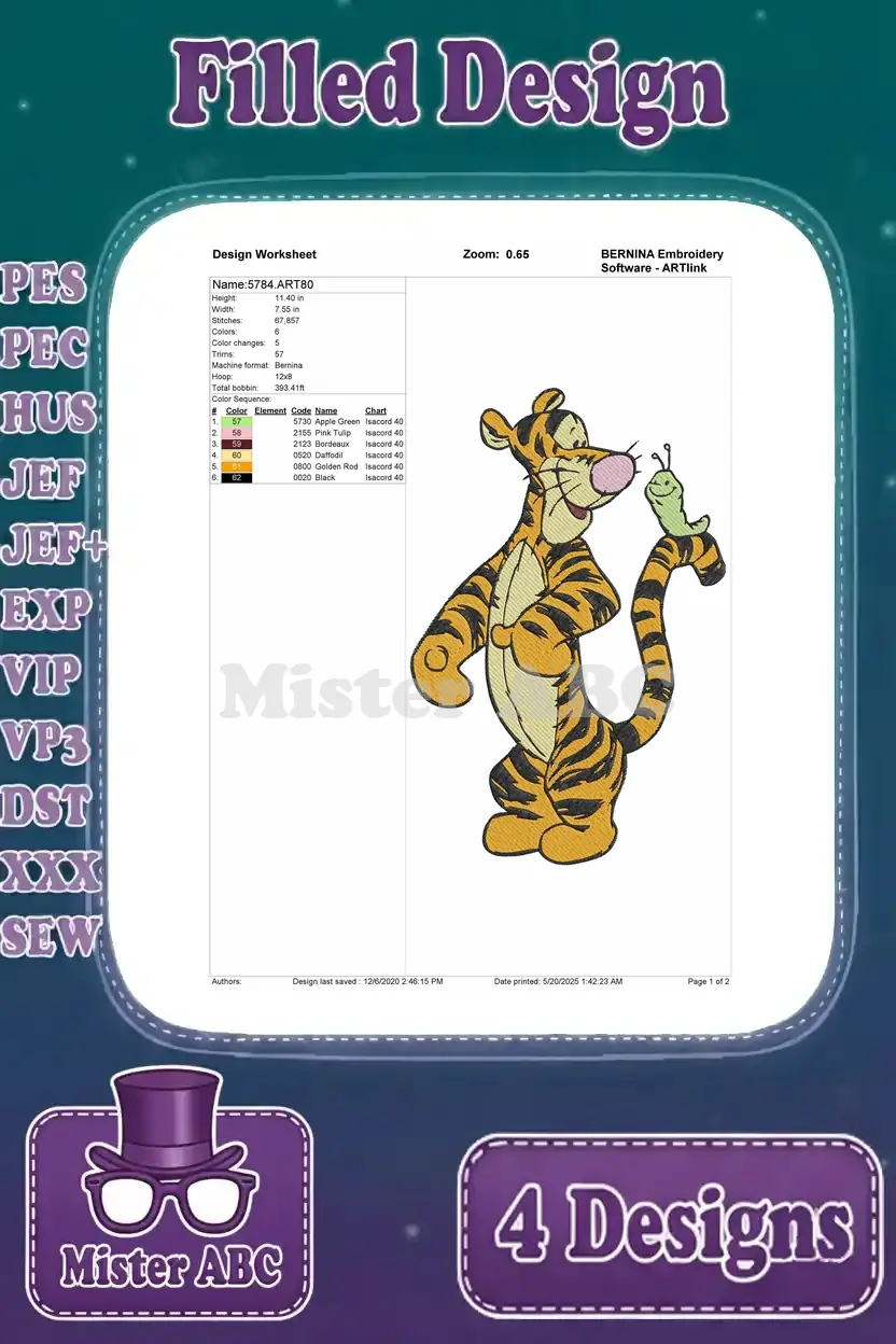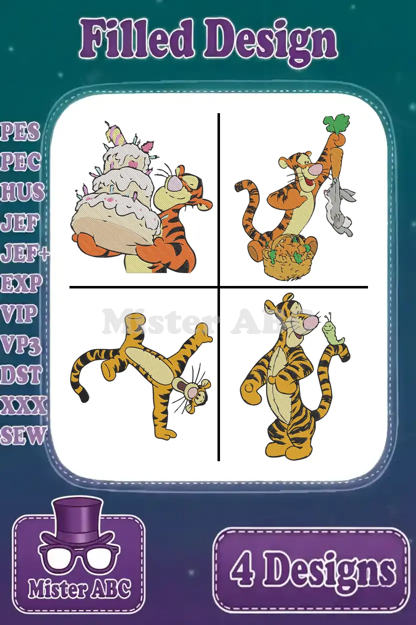 Capture the playful spirit of Tigger with this delightful embroidery bundle featuring four unique, vibrant filled designs. Perfect for adding joy to any project!