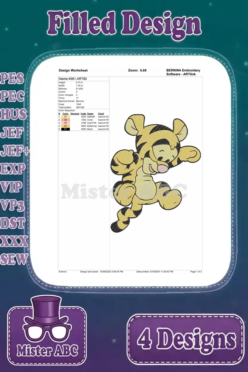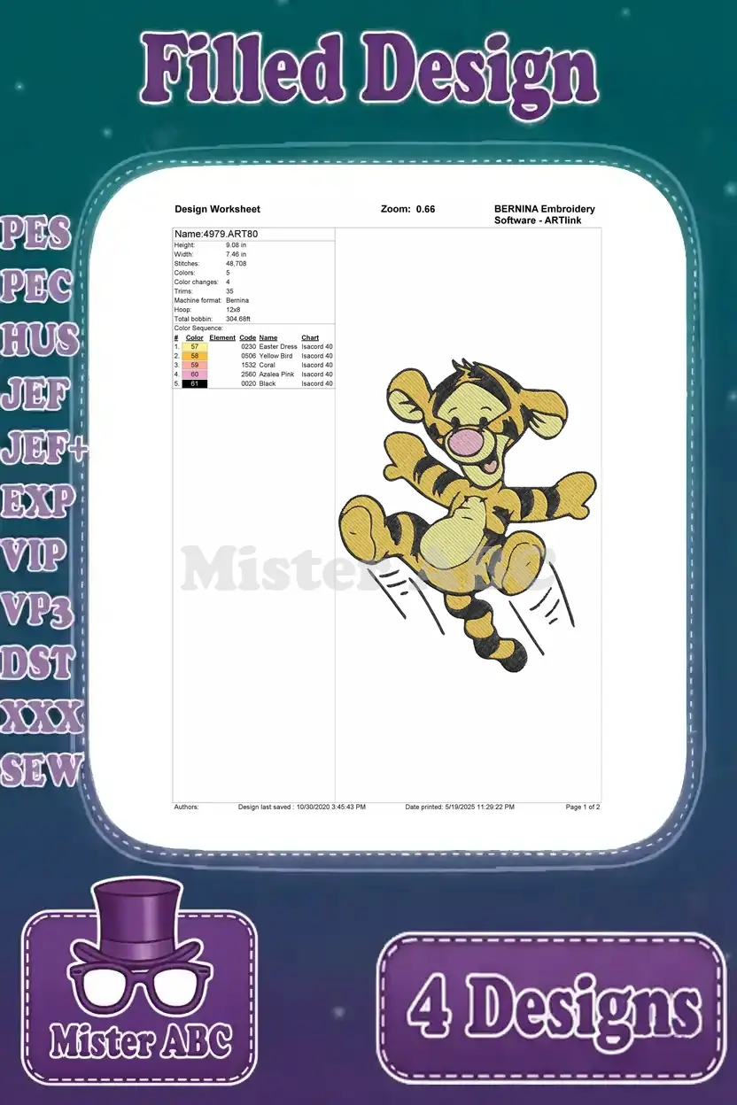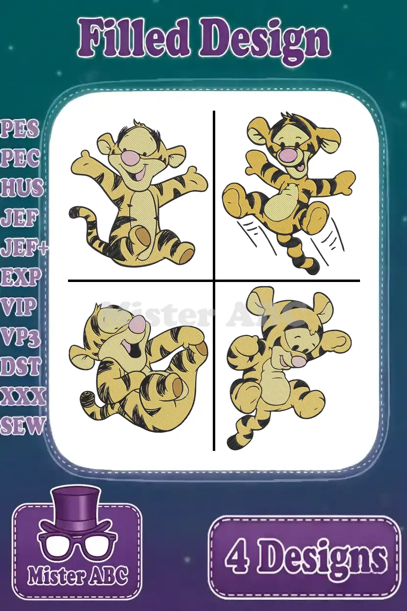 Bring the bouncing joy of Tigger to life with this delightful embroidery design bundle! Four vibrant, filled designs.