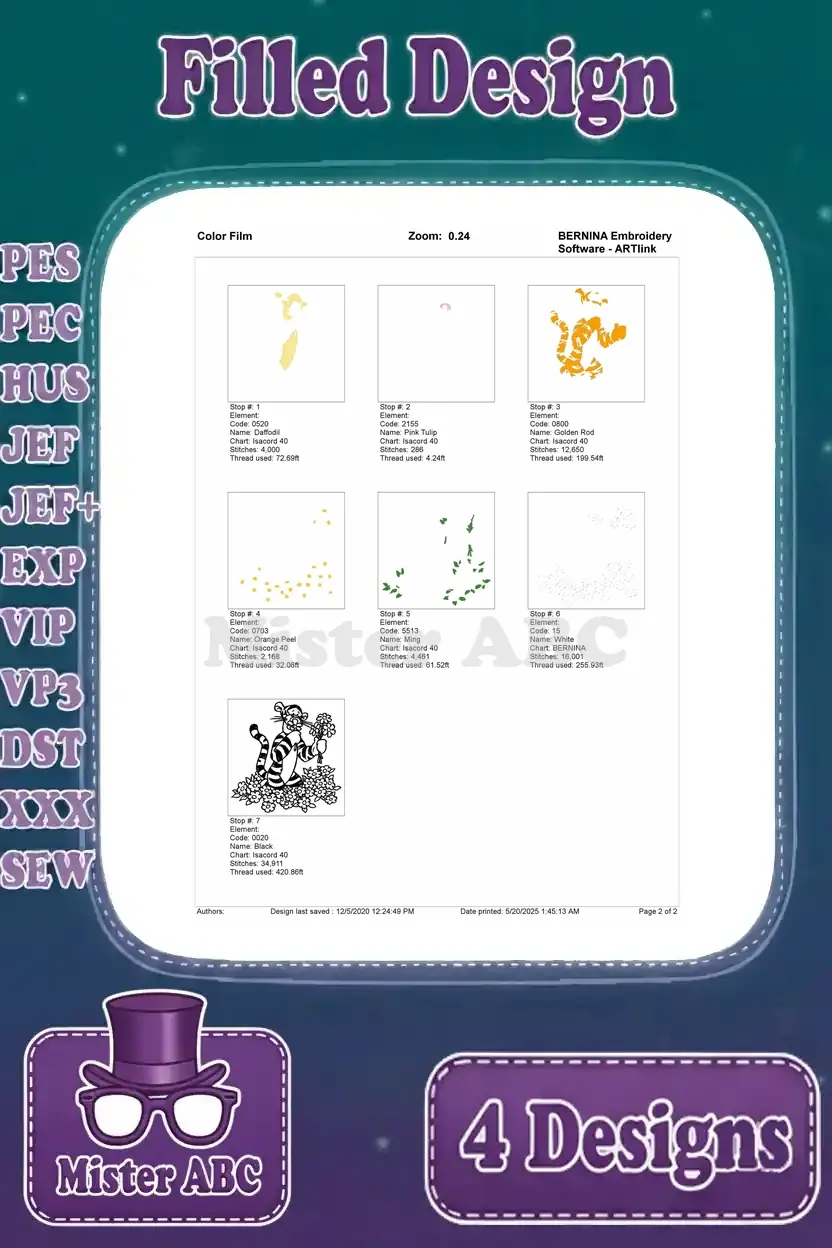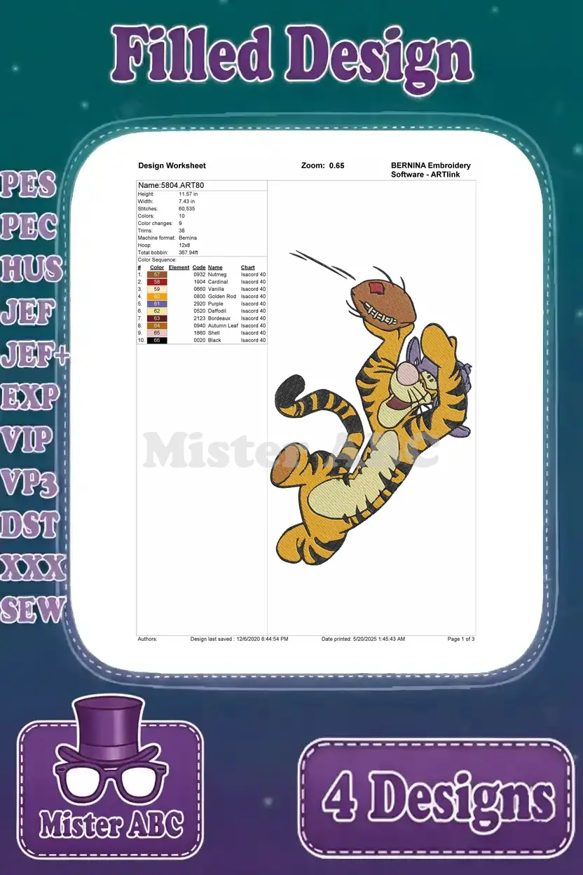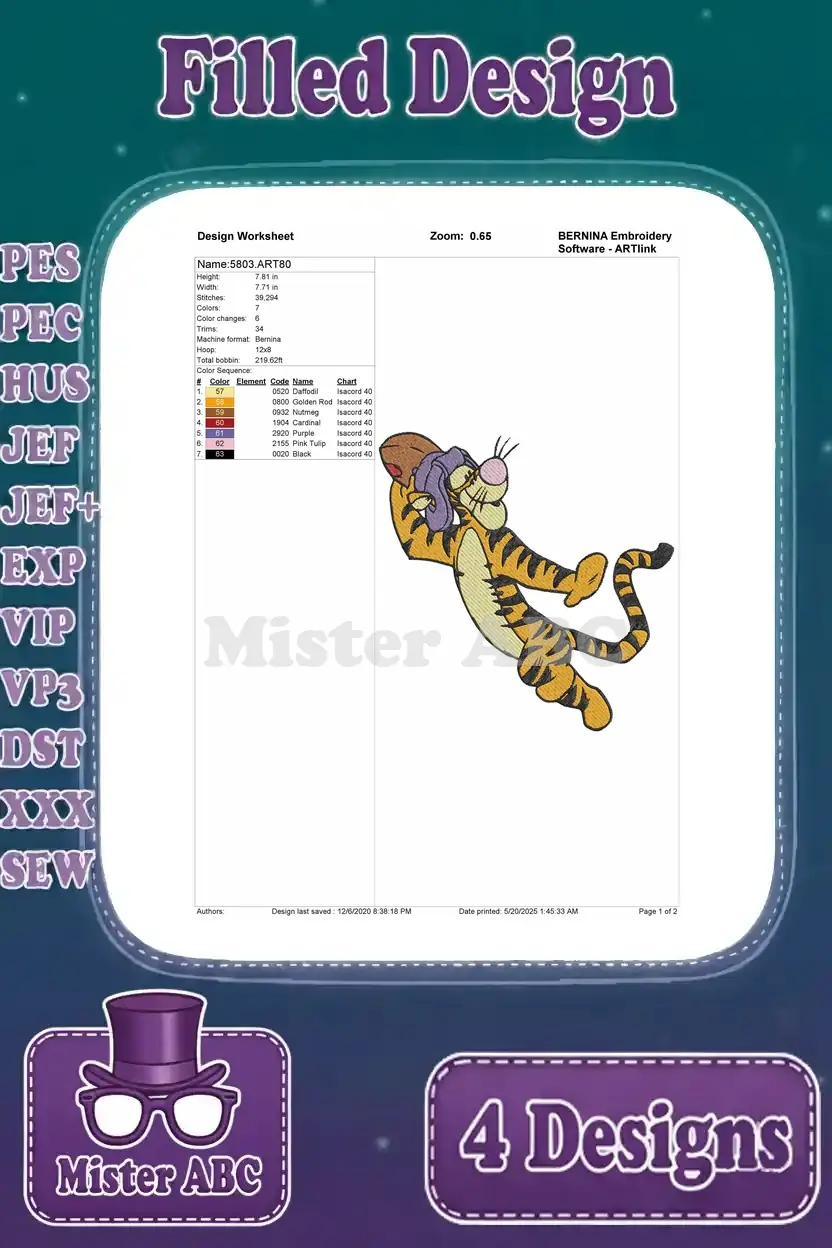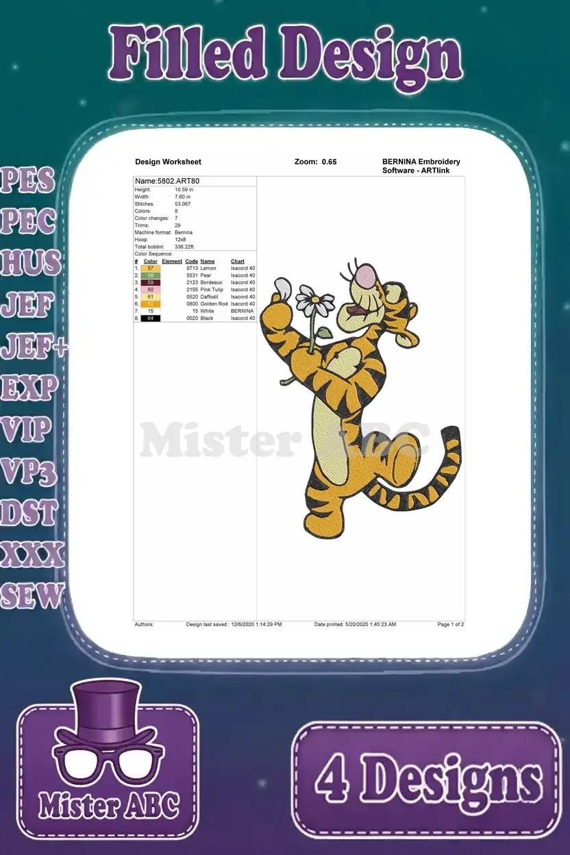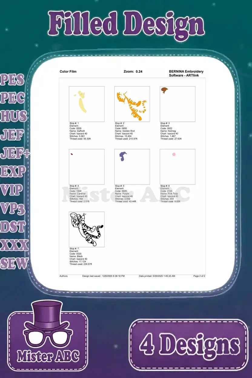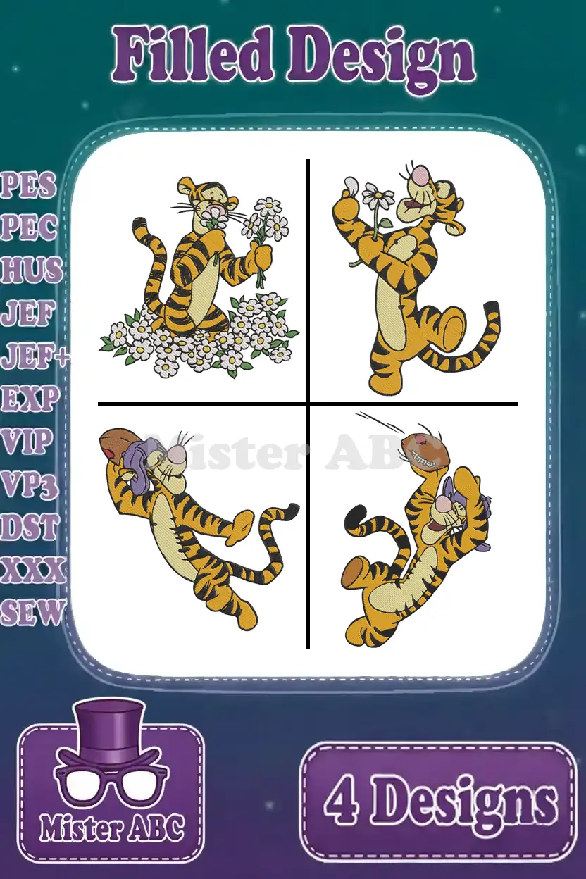 Bounce into fun with this vibrant Tigger embroidery bundle! Four filled designs capture Tigger’s playful spirit, perfect for fans.
