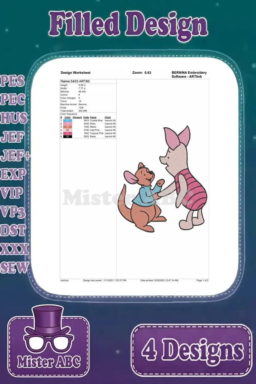 Delightful Winnie the Pooh character embroidery bundle featuring Piglet, Tigger, Kanga, and Roo in four charming designs. Perfect for adding a whimsical touch to any project.