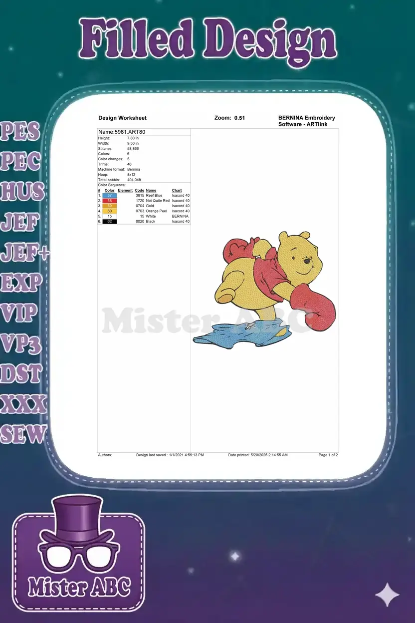 Delightful Winnie the Pooh embroidery, perfect for adding whimsy. Pooh Bear comically struggles with clothes, bringing joy and charm to any project.