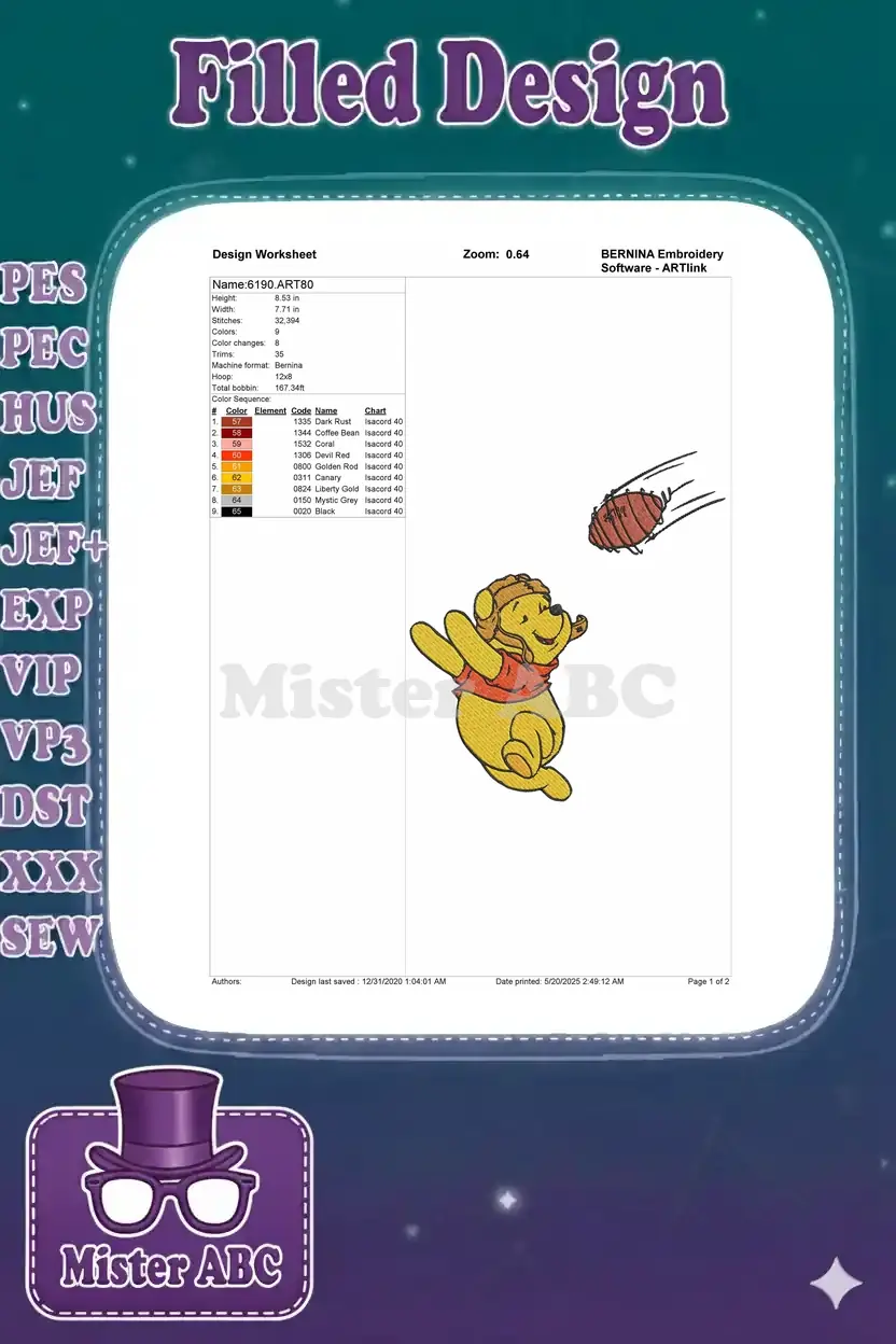 Winnie the Pooh wearing pilot hat catching football embroidery designs