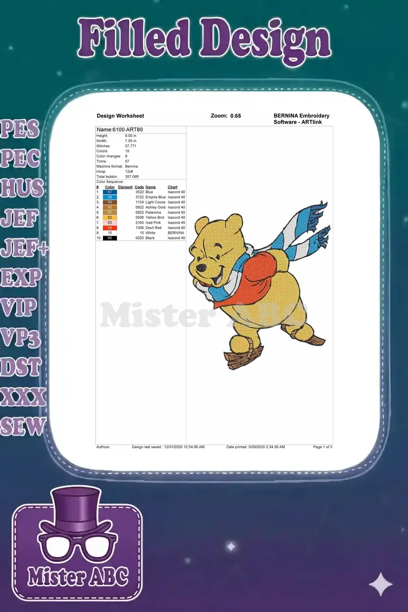 Winnie the Pooh Winter Wonderland Skating Scarf Embroidery Designs – Instant Download
