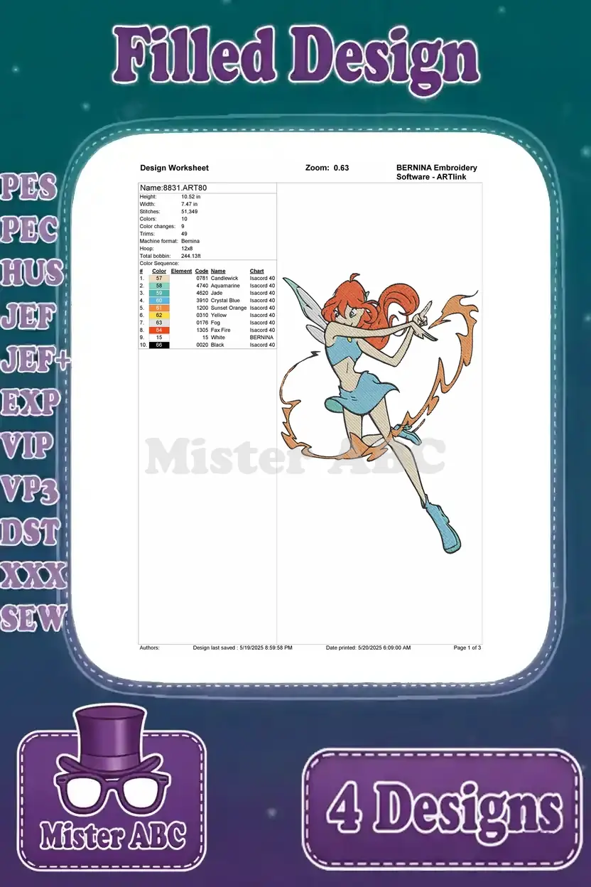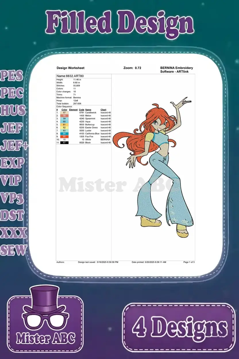 Discover enchanting Winx Club Bloom embroidery designs! A vibrant bundle perfect for fans, ready to personalize your projects with magical flair.