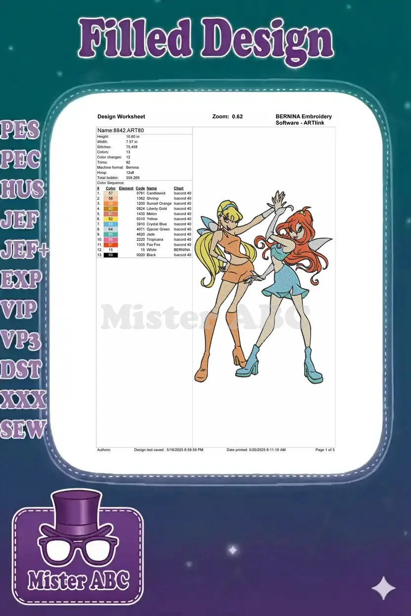 Vibrant embroidery featuring Winx Club’s Bloom and Stella, captured in a magical, dynamic pose. Perfect for fans!