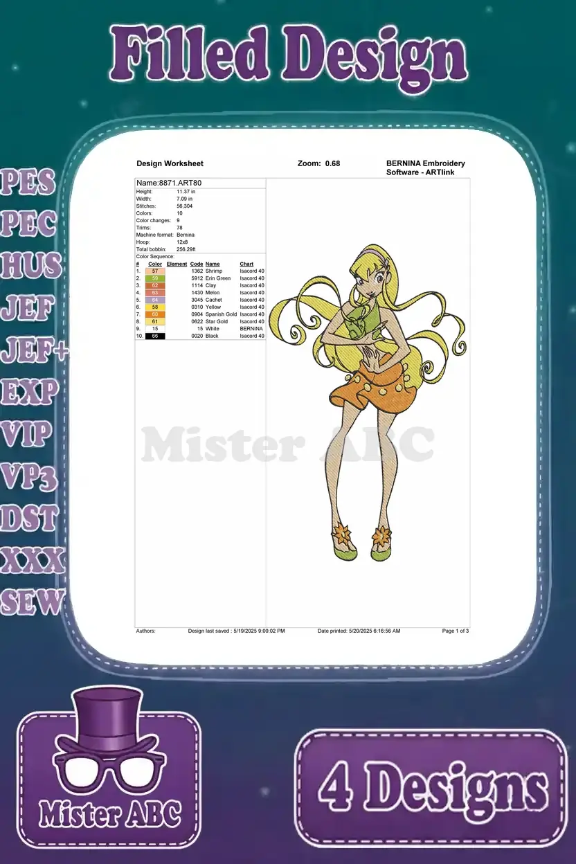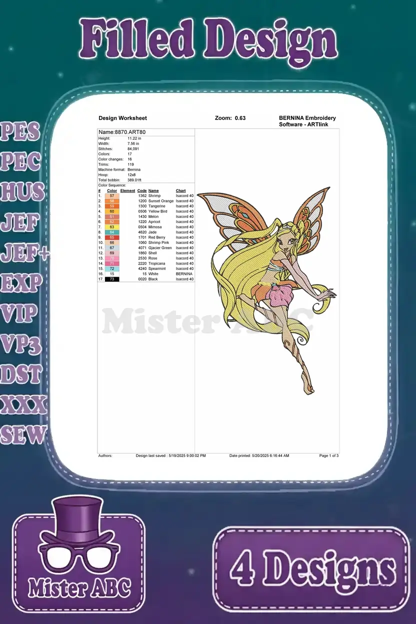 Transform your projects with this enchanting Winx Club Stella embroidery bundle, featuring four dynamic designs!