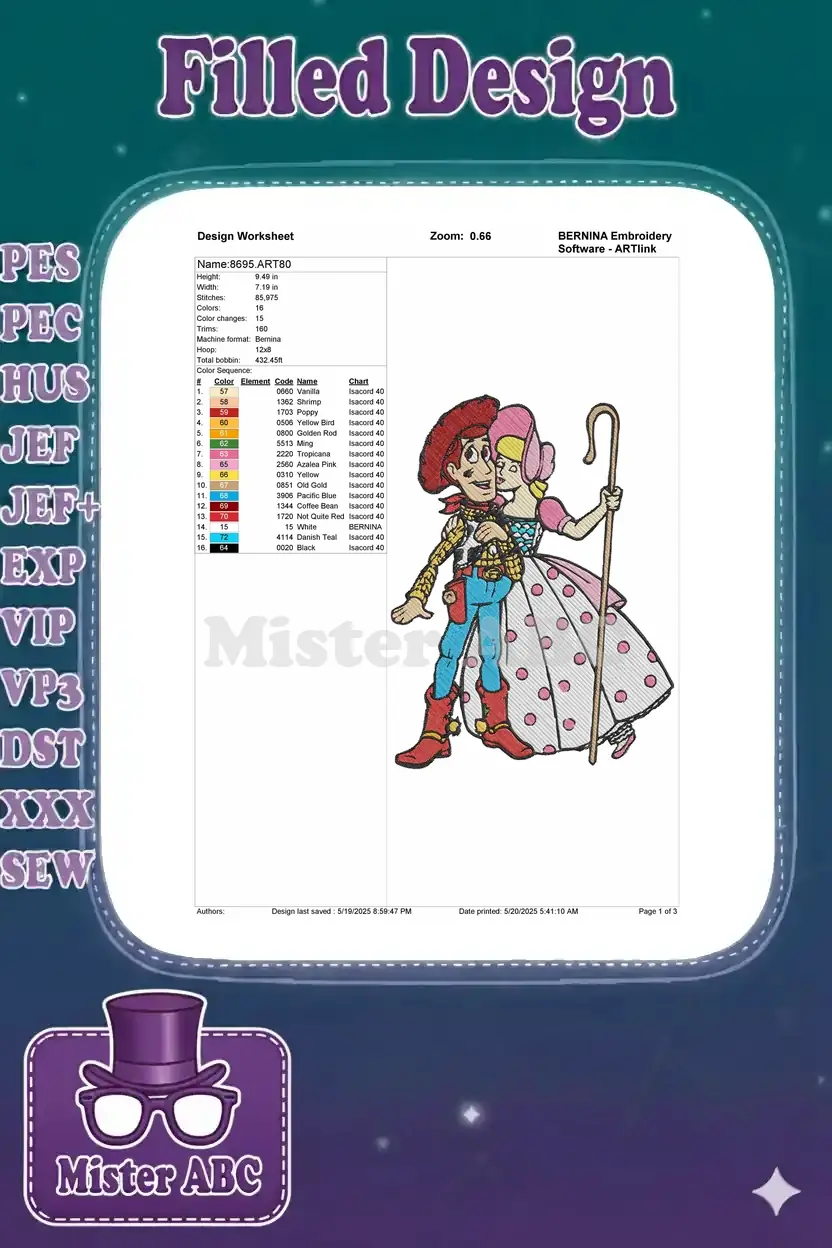 Woody and Bo Peep Embracing Toy Story Characters Embroidery Designs