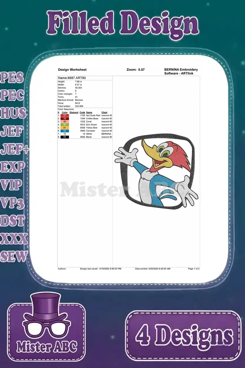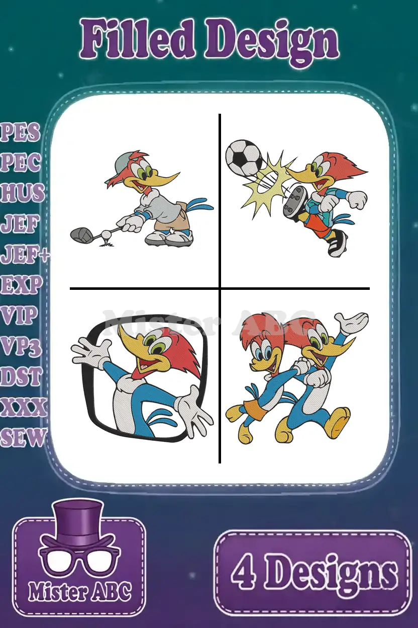 Woody Woodpecker Playing Golf And Soccer Action Poses And Logo Character – Filled Embroidery Design
