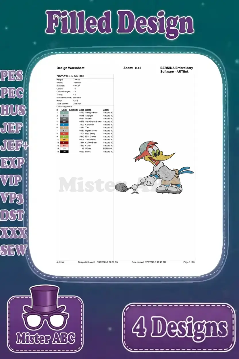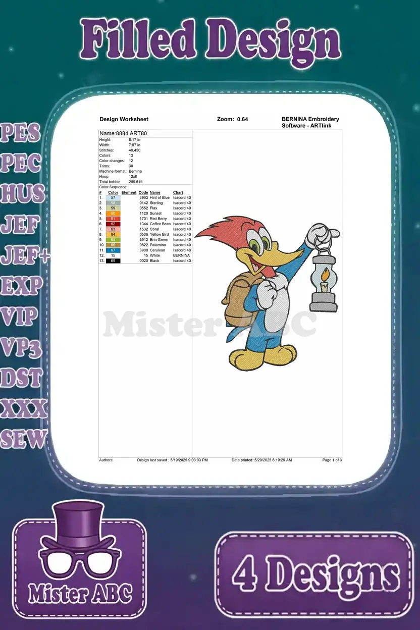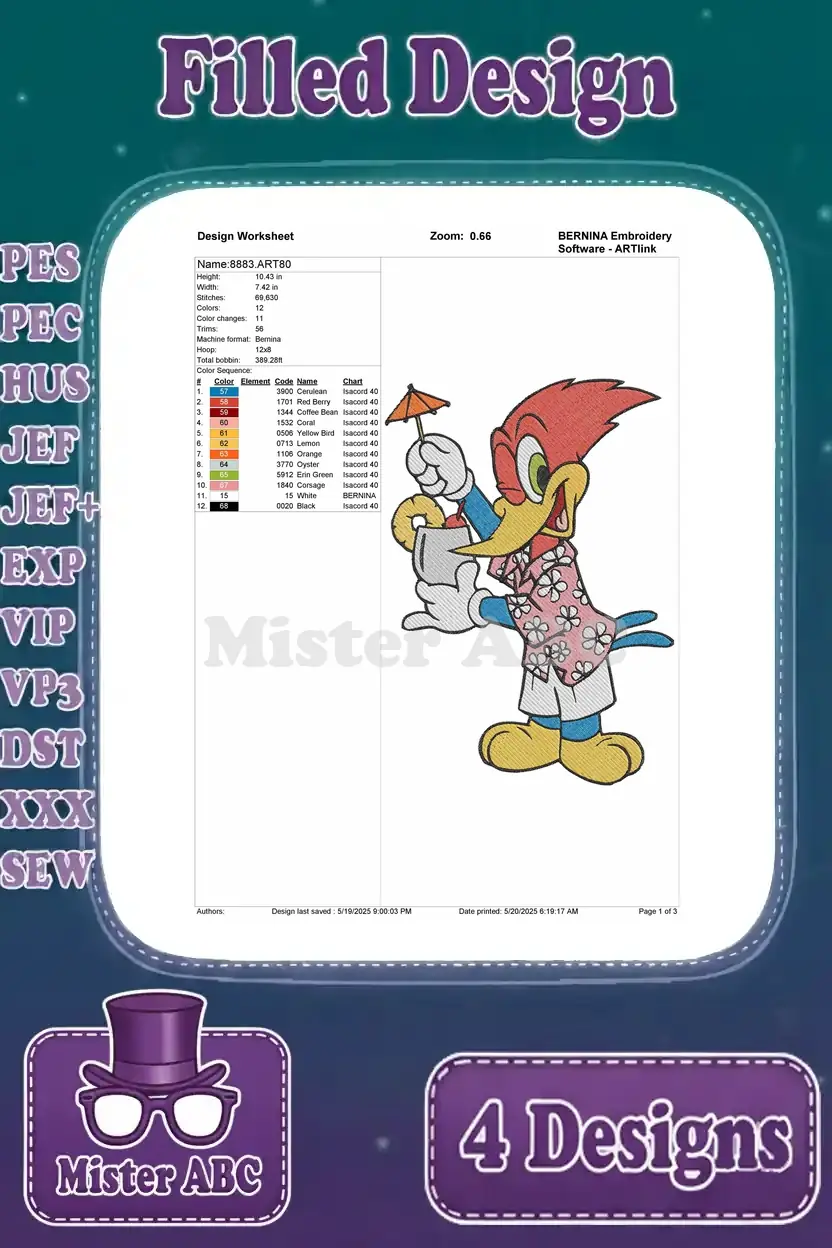Bring iconic cartoon charm to your projects with this vibrant Woody Woodpecker embroidery bundle! Four filled designs.