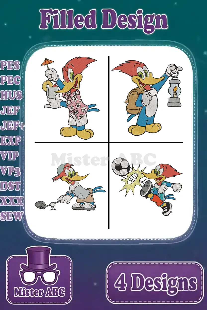 Woody Woodpecker Various Sporting Poses Golf Soccer And With Trophy Fun – Filled Embroidery Design – Instant Download