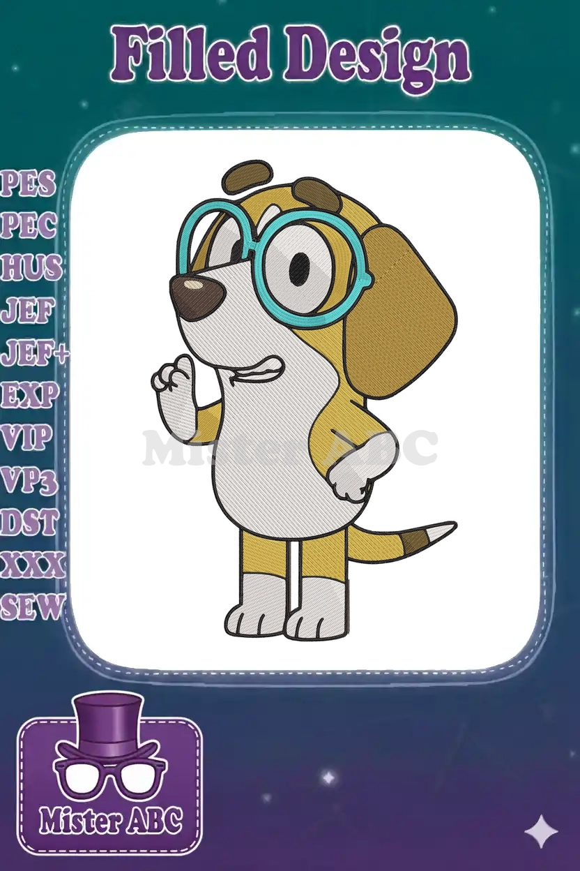 Vibrant fill embroidery of Lucky’s Dad from Bluey, perfect for adding a fun, detailed touch to any project. Capture his iconic look with this delightful design.