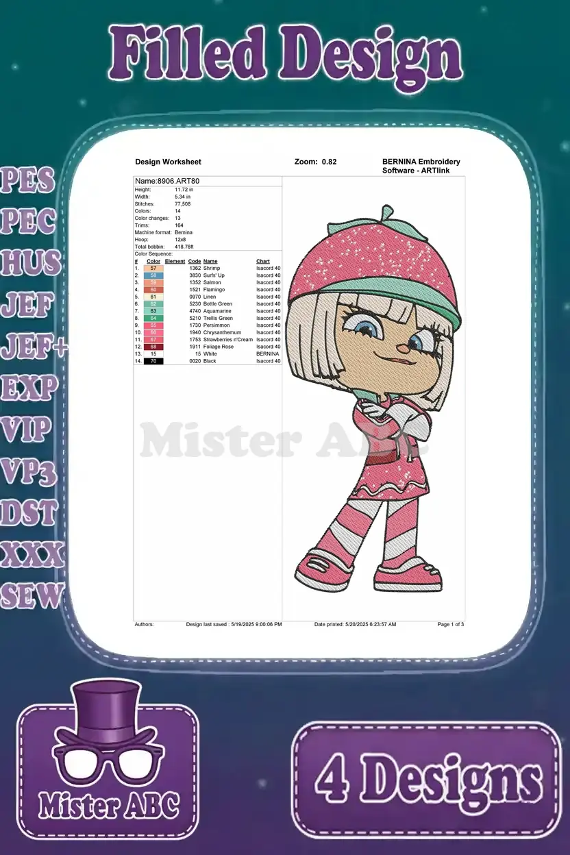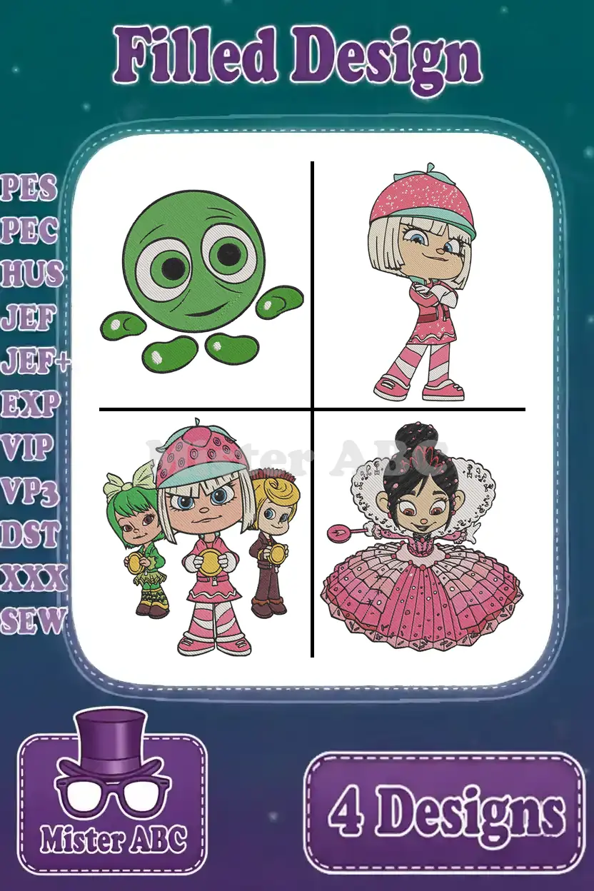 Wreck It Ralph Sugar Rush Racers Vanellope Taffyta Candlehead And Gloomy Glob – Filled Embroidery Design