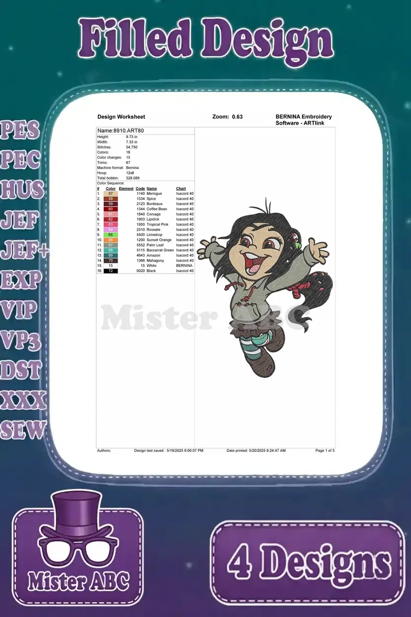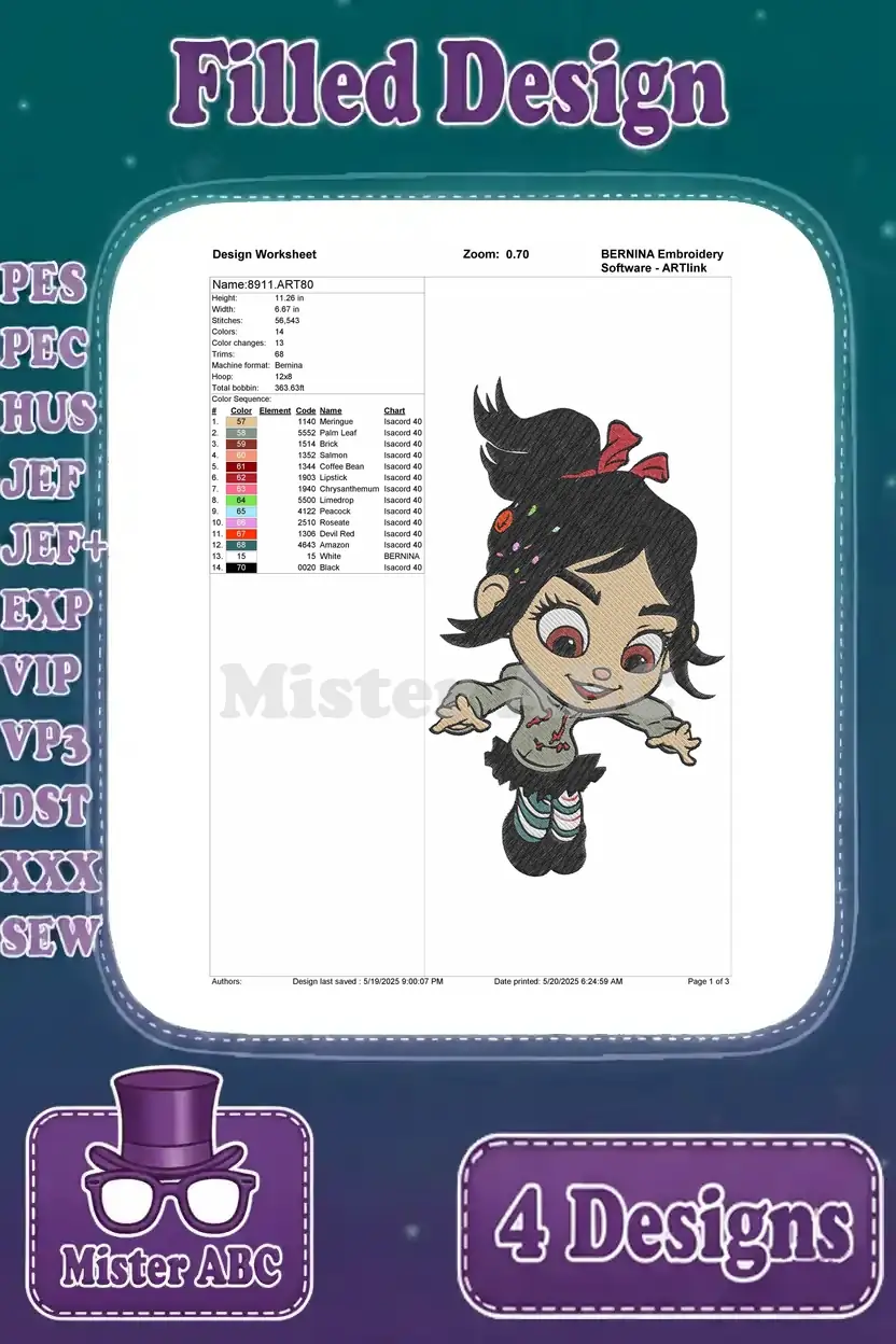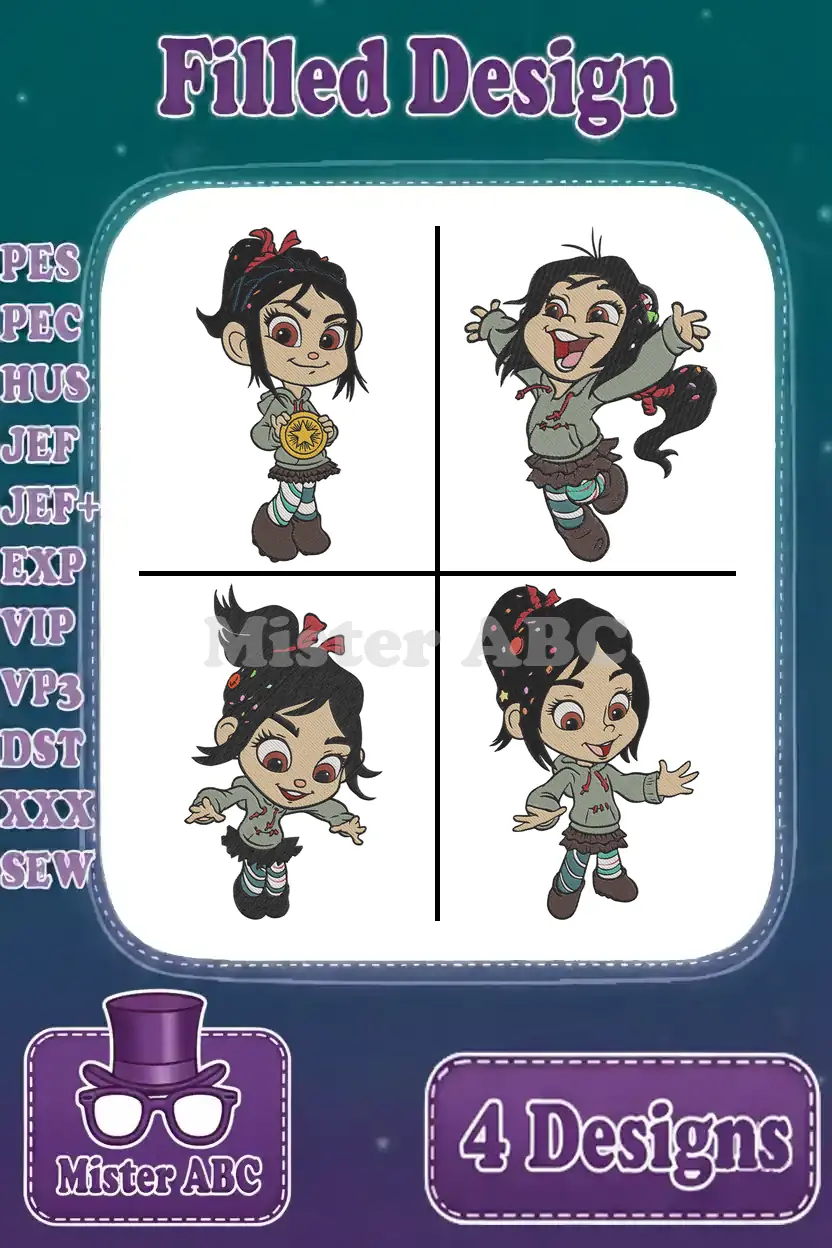 Wreck It Ralph Vanellope Von Schweetz Glitch Racer Various Action Poses – Filled Embroidery Design
