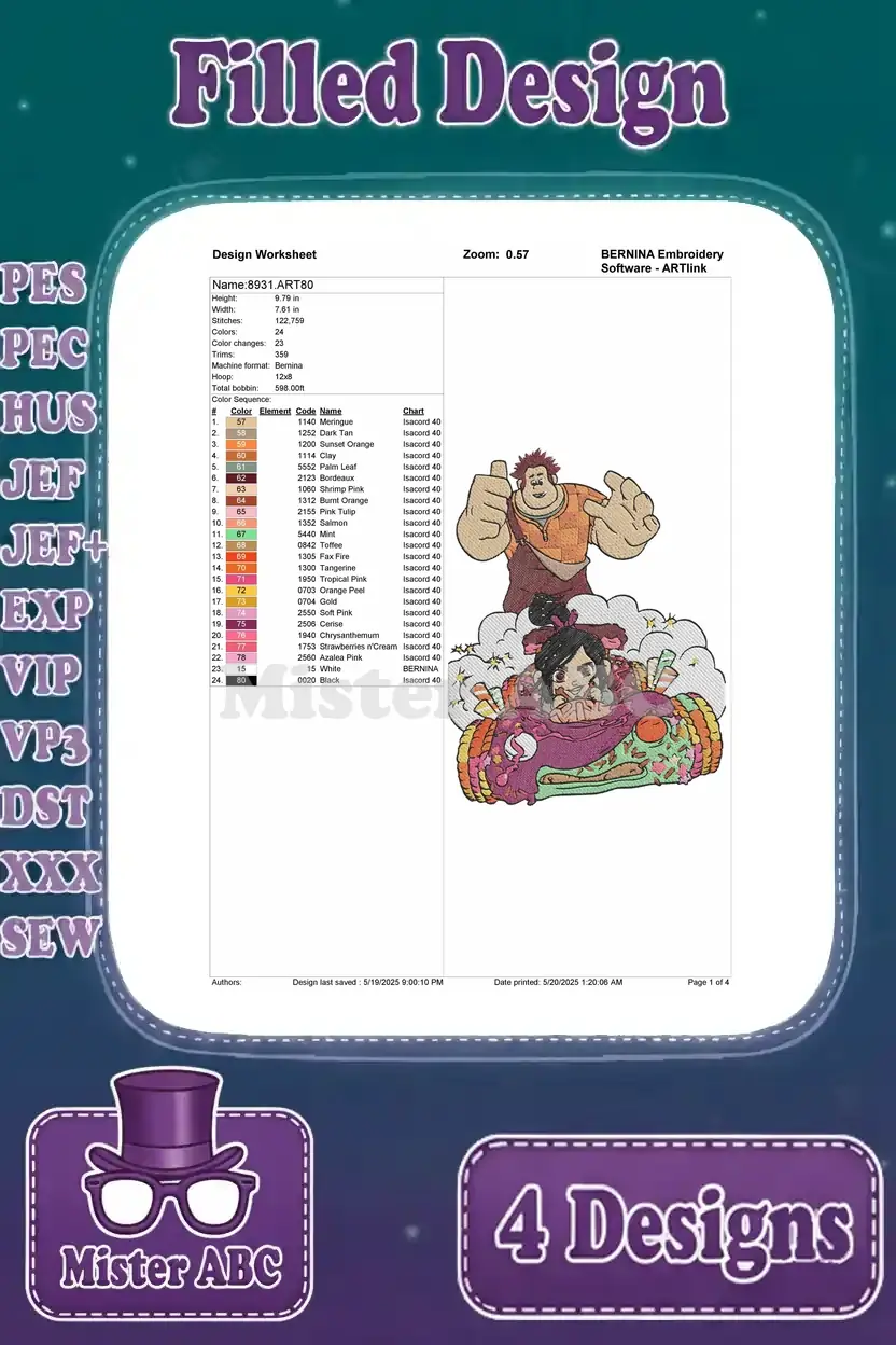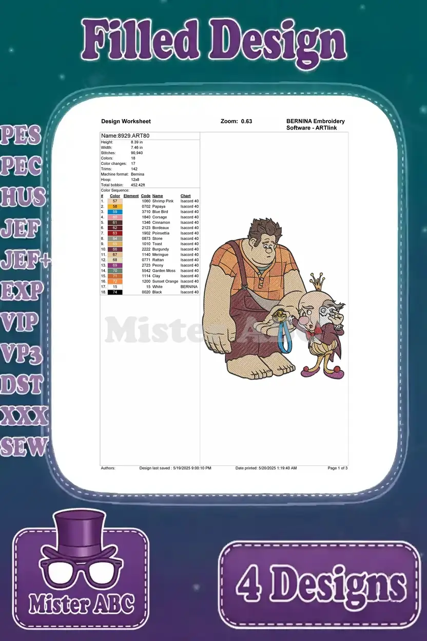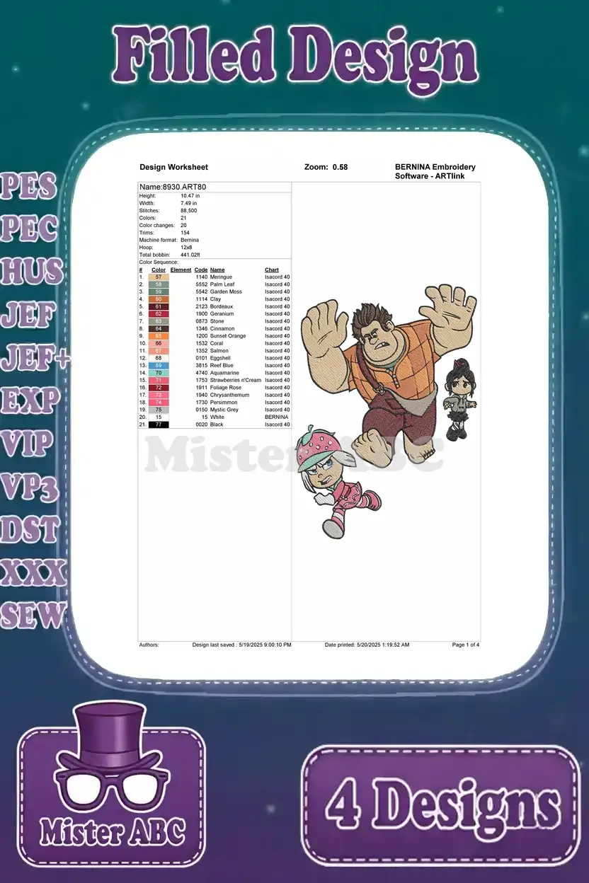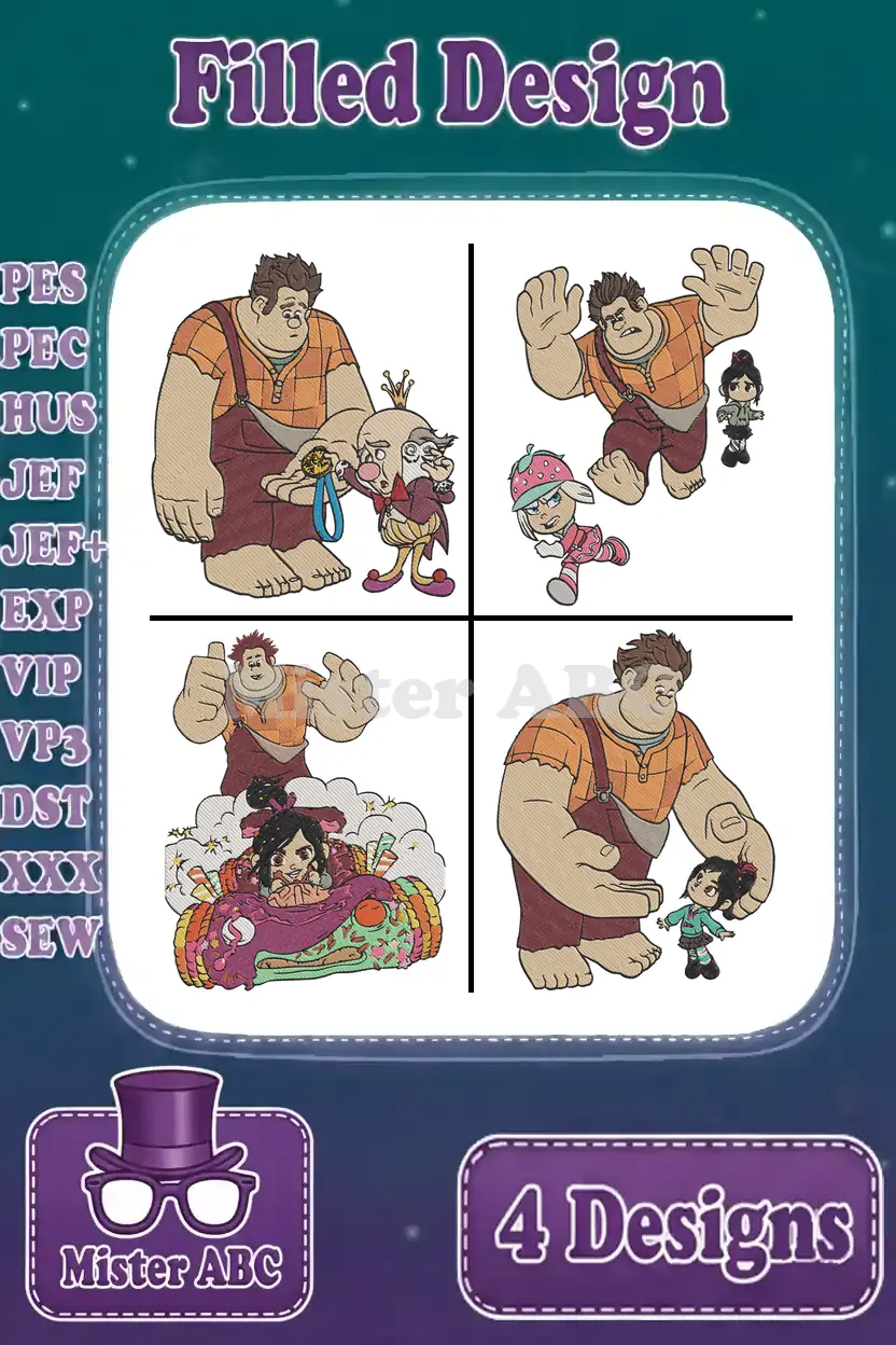 Dive into the arcade world with this vibrant Wreck-It Ralph embroidery bundle featuring four filled stitch designs. Perfect for fans!