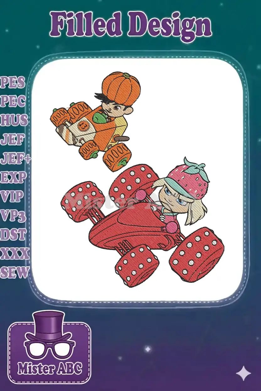 Race to fun with these vibrant embroidery designs featuring two adorable kart racers, perfect for adding playful charm to any project.