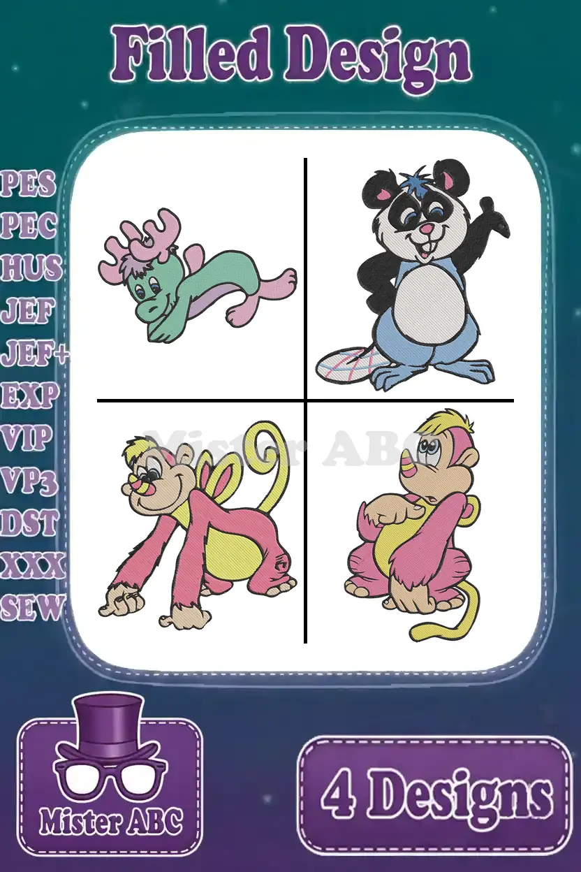 The Wuzzles Style Hybrid Animals – Moosel Bumblelion Hoppopotamus Panda Creature – Retro Coon Character Group – Filled Embroidery Design