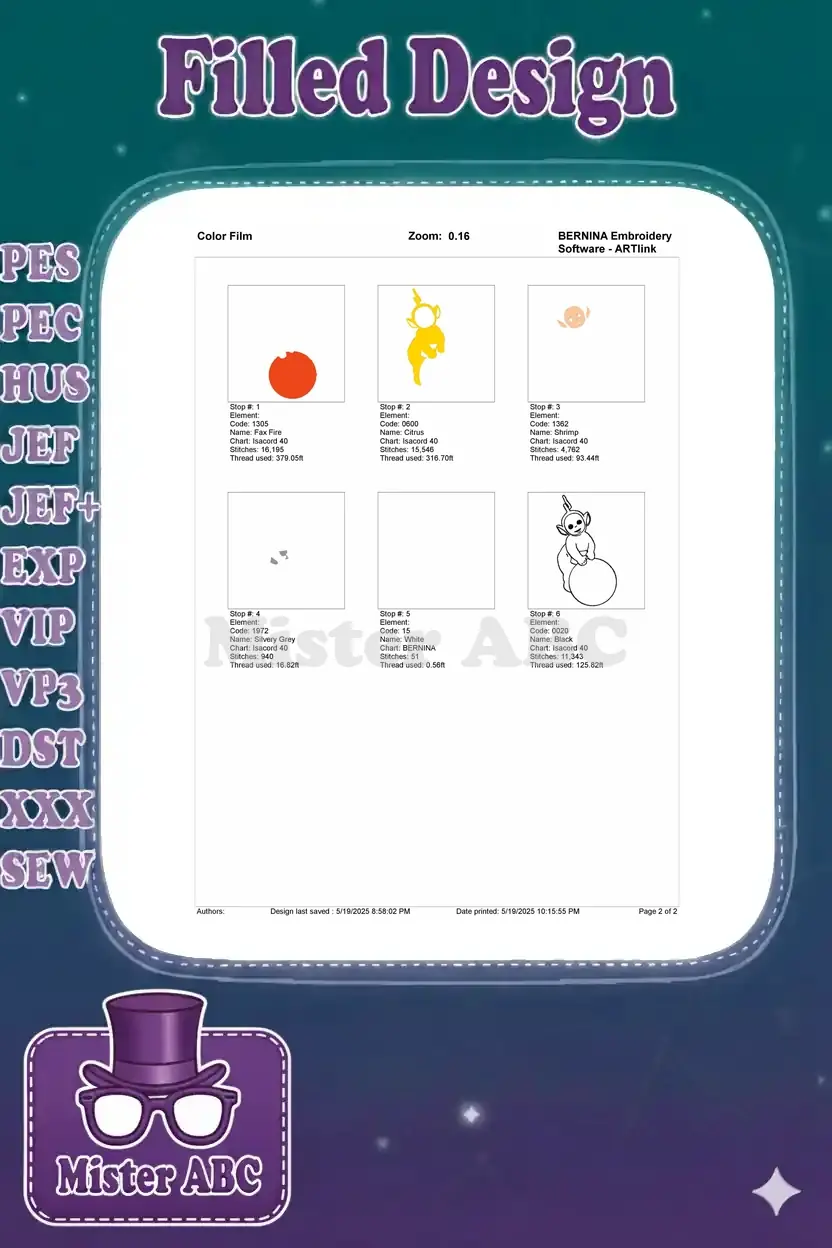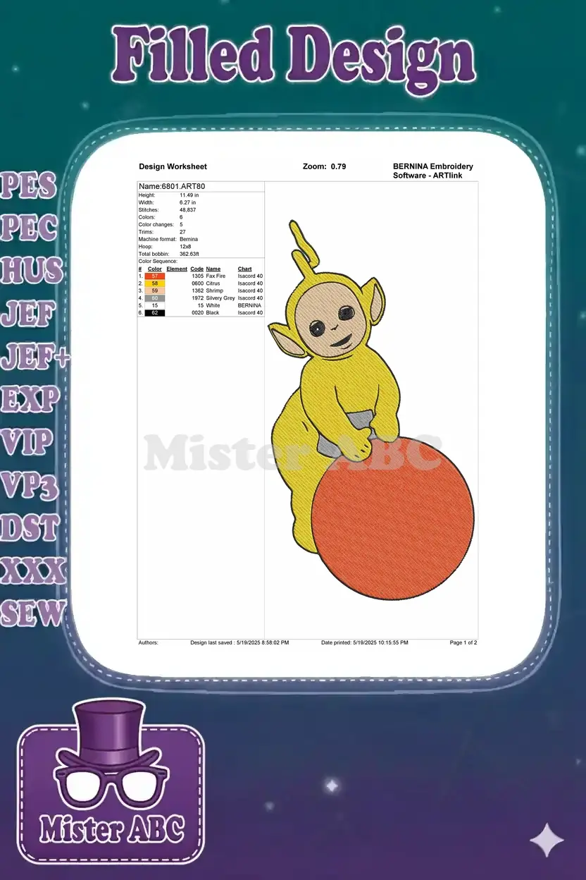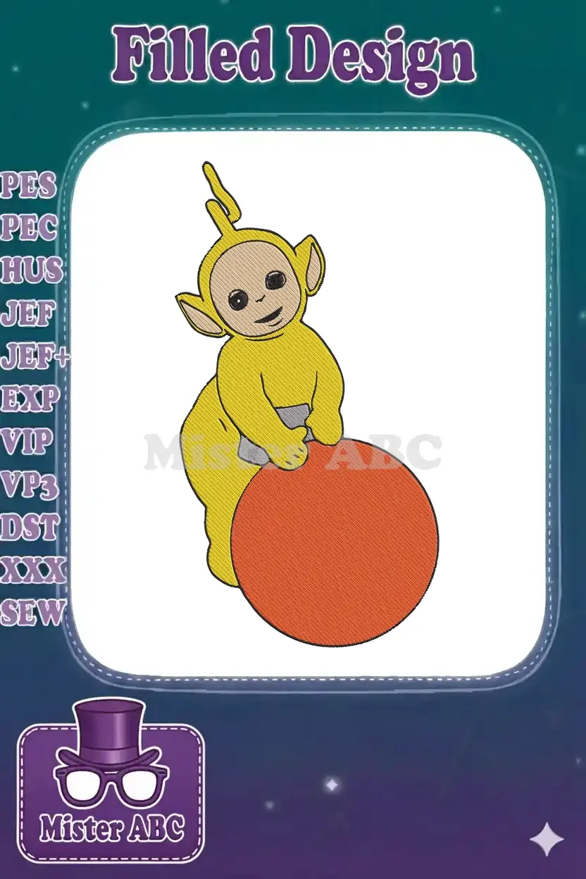 Yellow Teletubby Laa-Laa playing with large orange ball embroidery designs