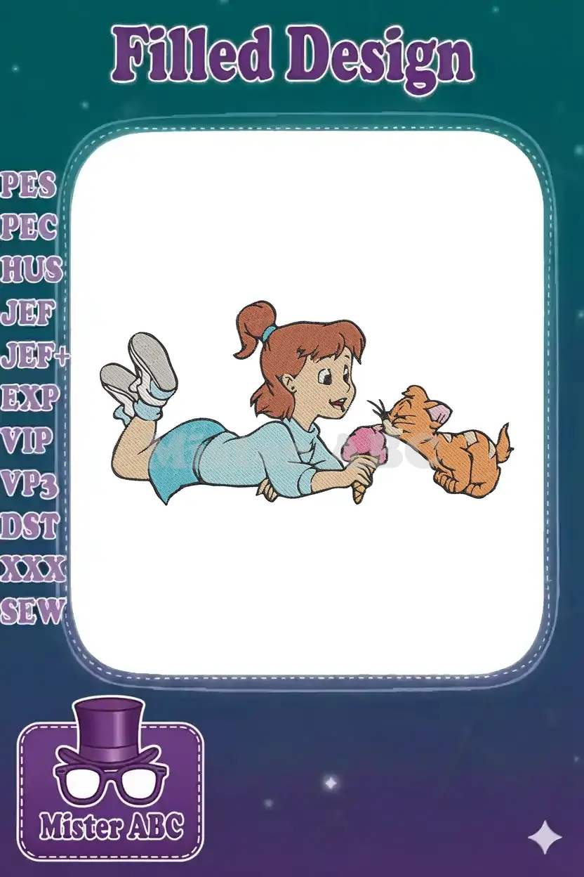 Young girl and cute orange cat sharing ice cream embroidery designs