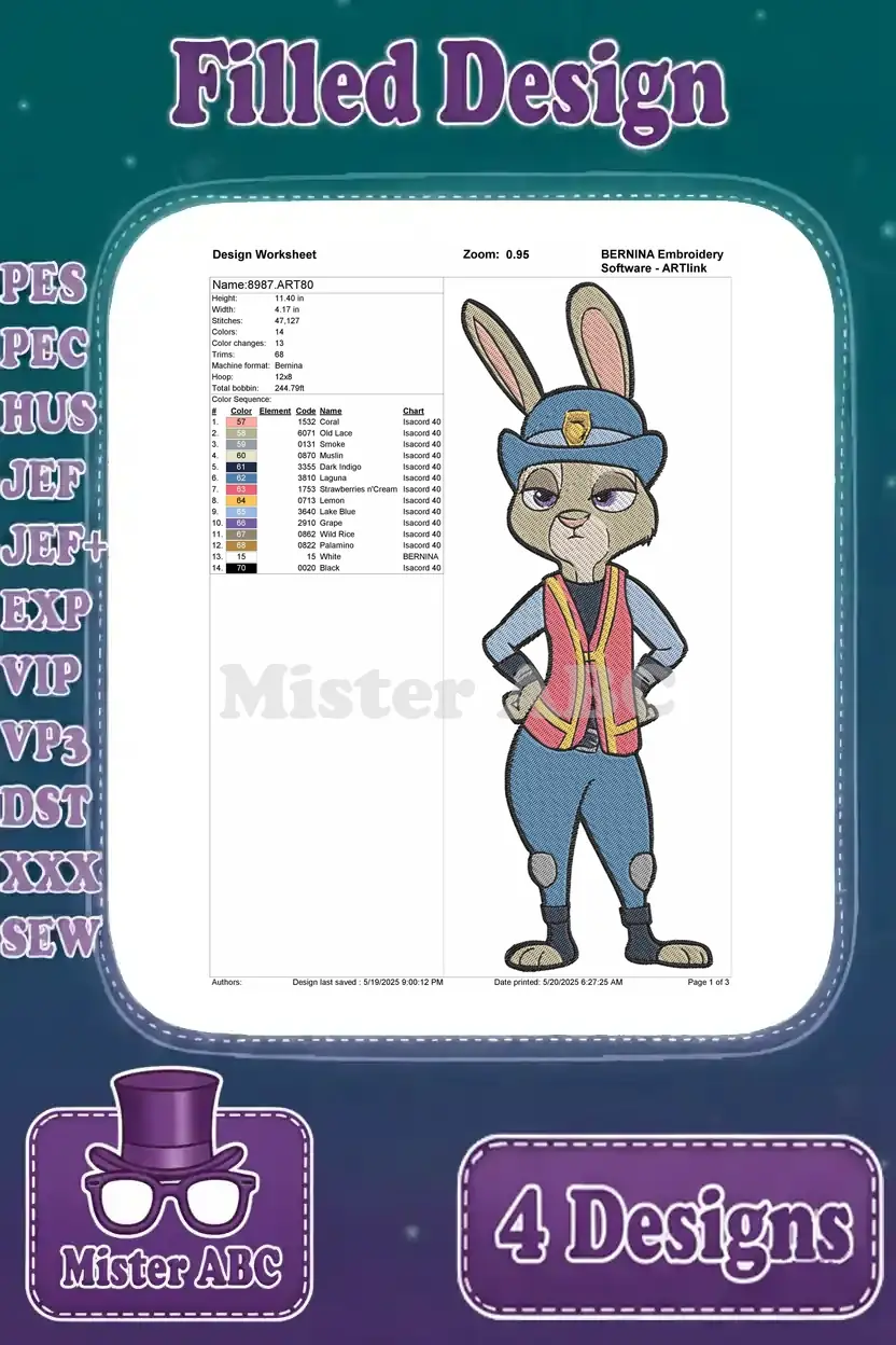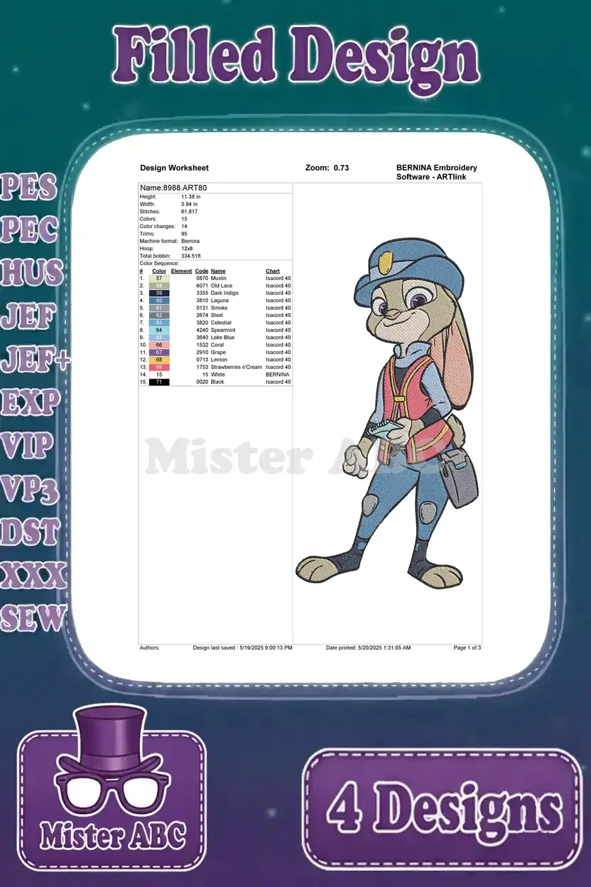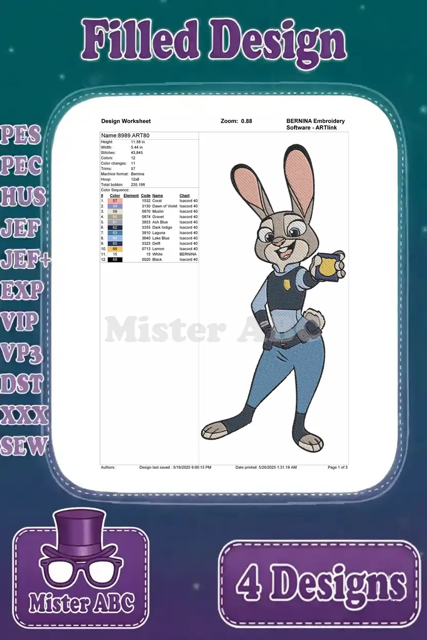 Zootopia Characters – Judy Hopps Police Officer – Mr Big The Arctic Shrew And Fru Fru – Disney Citizens – Filled Embroidery Design