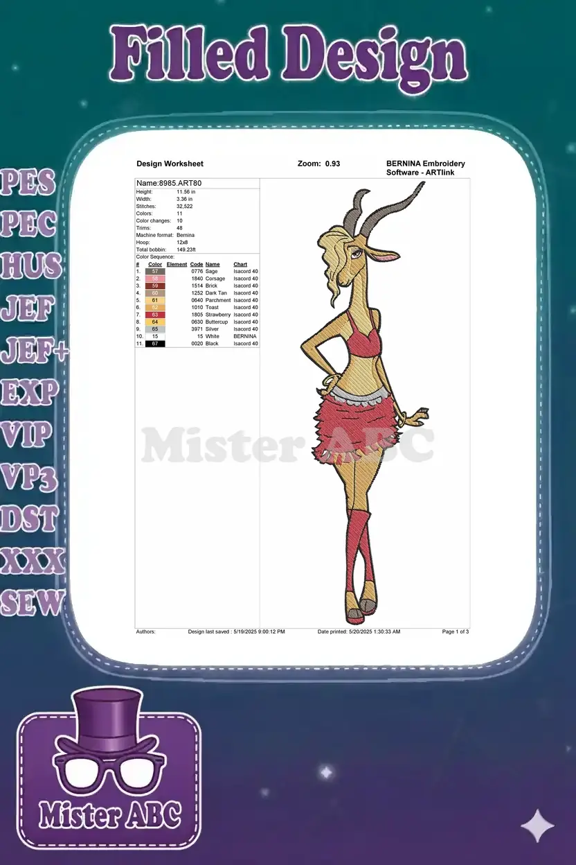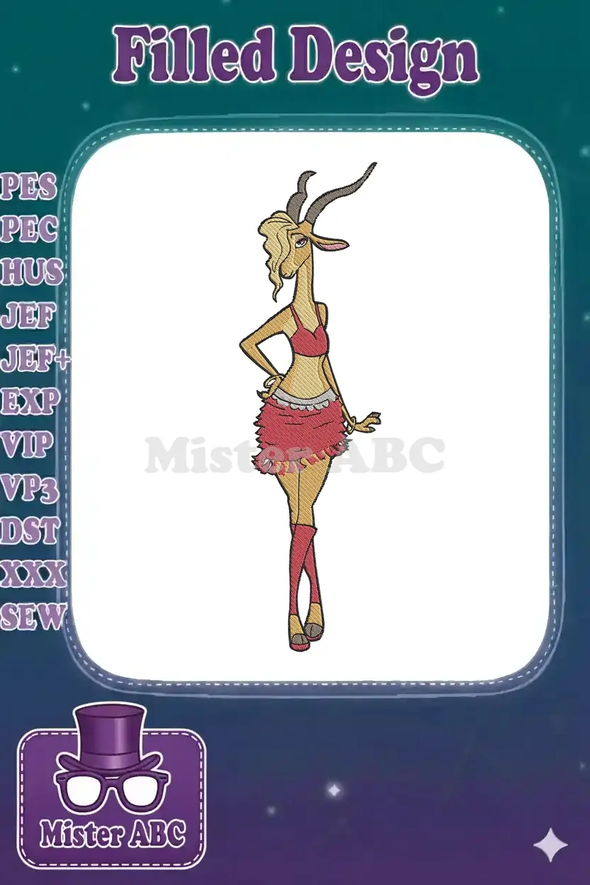 Bring the vibrant energy of Gazelle’s performance to your textiles with this stunning embroidery design. Perfect for fans of Zootopia!